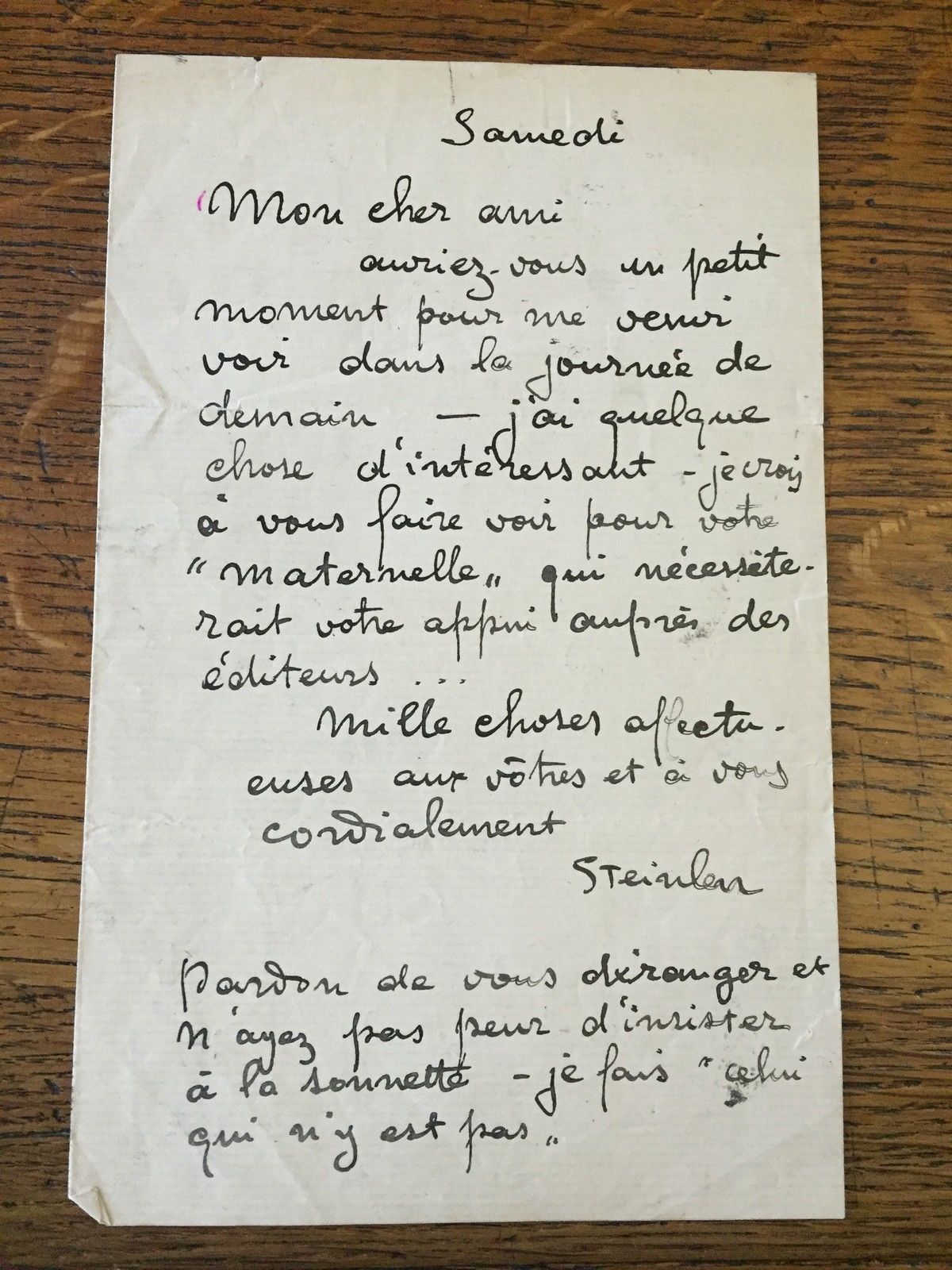 Letter to Leon Frapie (discussing Steinlen's illustrations for Frapie's novel, La Maternelle, that later won the Prix Goncourt) (Private collection, U.S.)